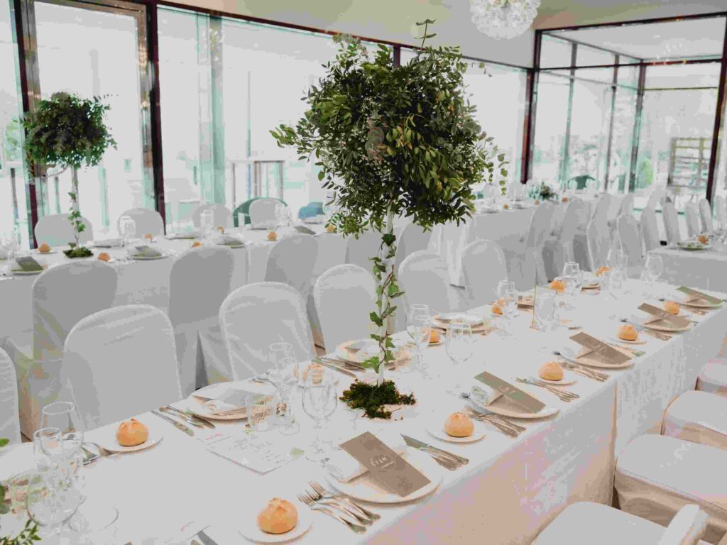 El espacio del banquete se decoró en blanco, con detalles en verde que aportaban frescura y elegancia, y estuvo a cargo de Floristería Ana, que supo combinar los tonos y materiales a la perfección. Las mesas estaban pensadas con mucho mimo: sencillas, pero con personalidad. Todo tenía ese aire natural y cuidado que encaja muy bien con el entorno de Campo Ramona y la pareja.