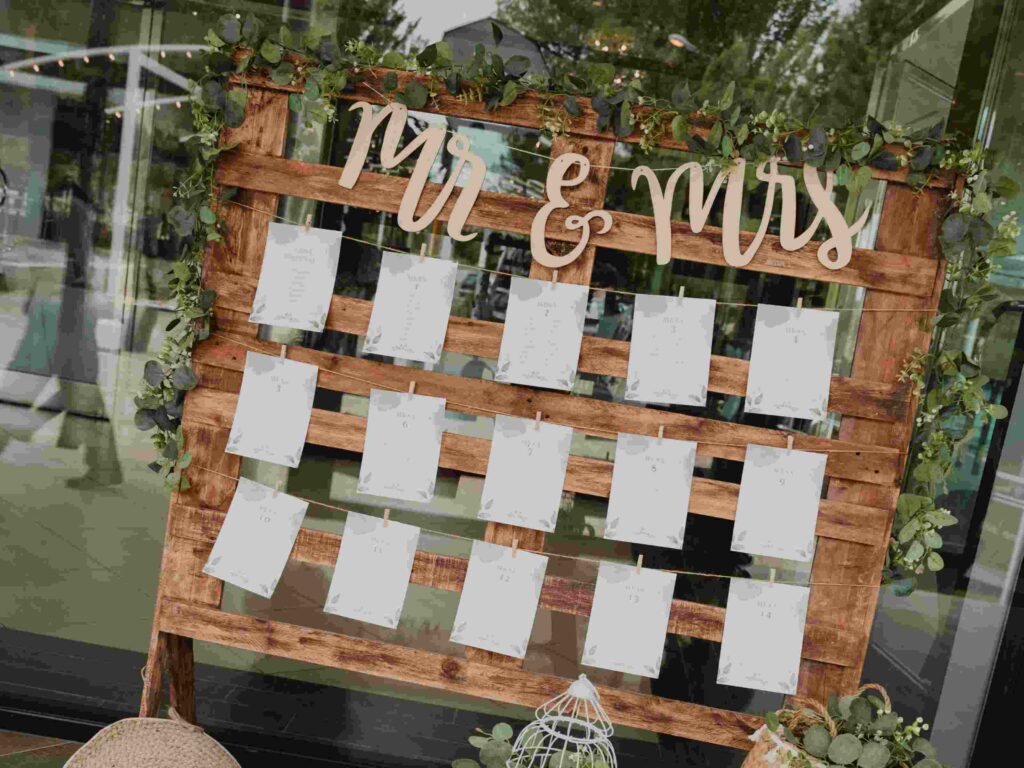 Seating plan rústico con mimbre y flores verdes
