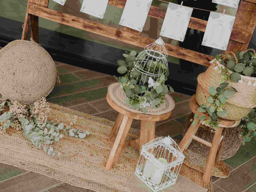 El seating plan fue uno de los rincones más bonitos. Con una estructura de madera, flores verdes y cestos de mimbre, consiguió ese efecto de rincón especial sin perder naturalidad. El mimbre, que estamos viendo mucho en bodas de verano, aporta ese toque rústico y cálido que tanto nos gusta: sencillo, ligero y muy en línea con lo que pide esta época del año.